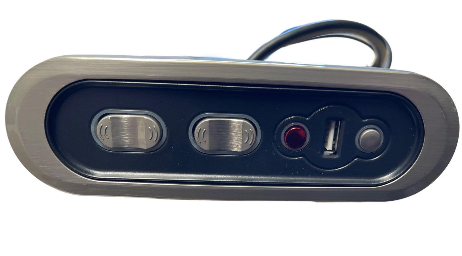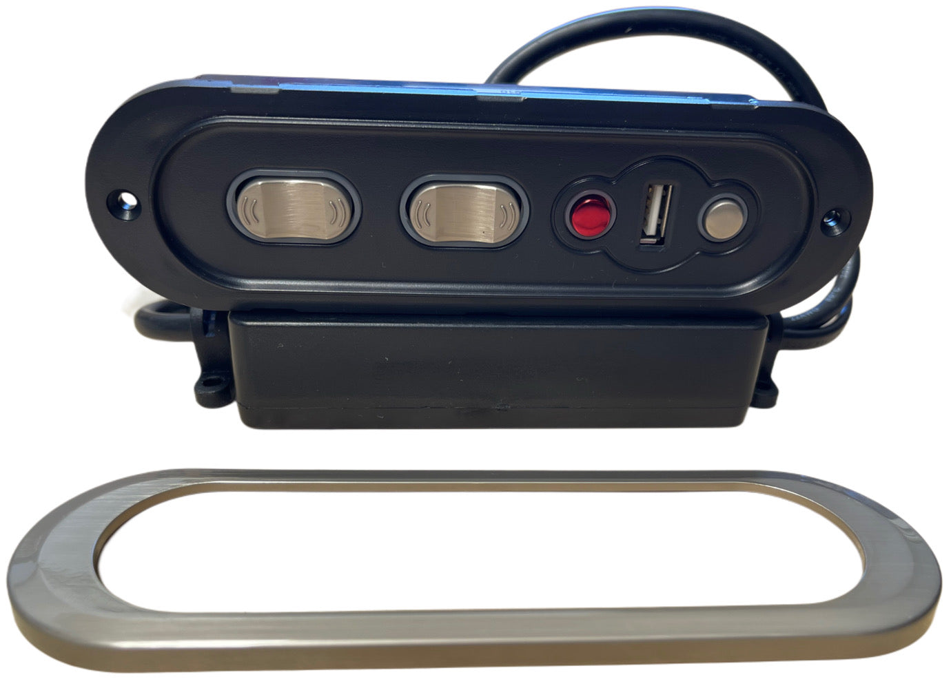 Mulin Switch AC065-2MABE-1U01 comes with Pewter look finish buttons and faceplate, USB wiring and 5 pin plug and white 2 pin connection as seen in the photos. Simple plug and play connection. Note the Red Button.