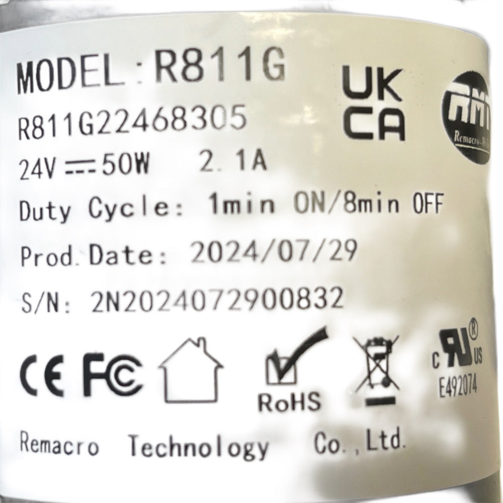 RMT Recliner Motor R811G replacement motor for recliner chairs and sofas. This Remarco Technology actuator, model No. R811G with Version No. R811G22468305 comes complete with a 5 pin plug and Ol Male power plug, ready for installation.