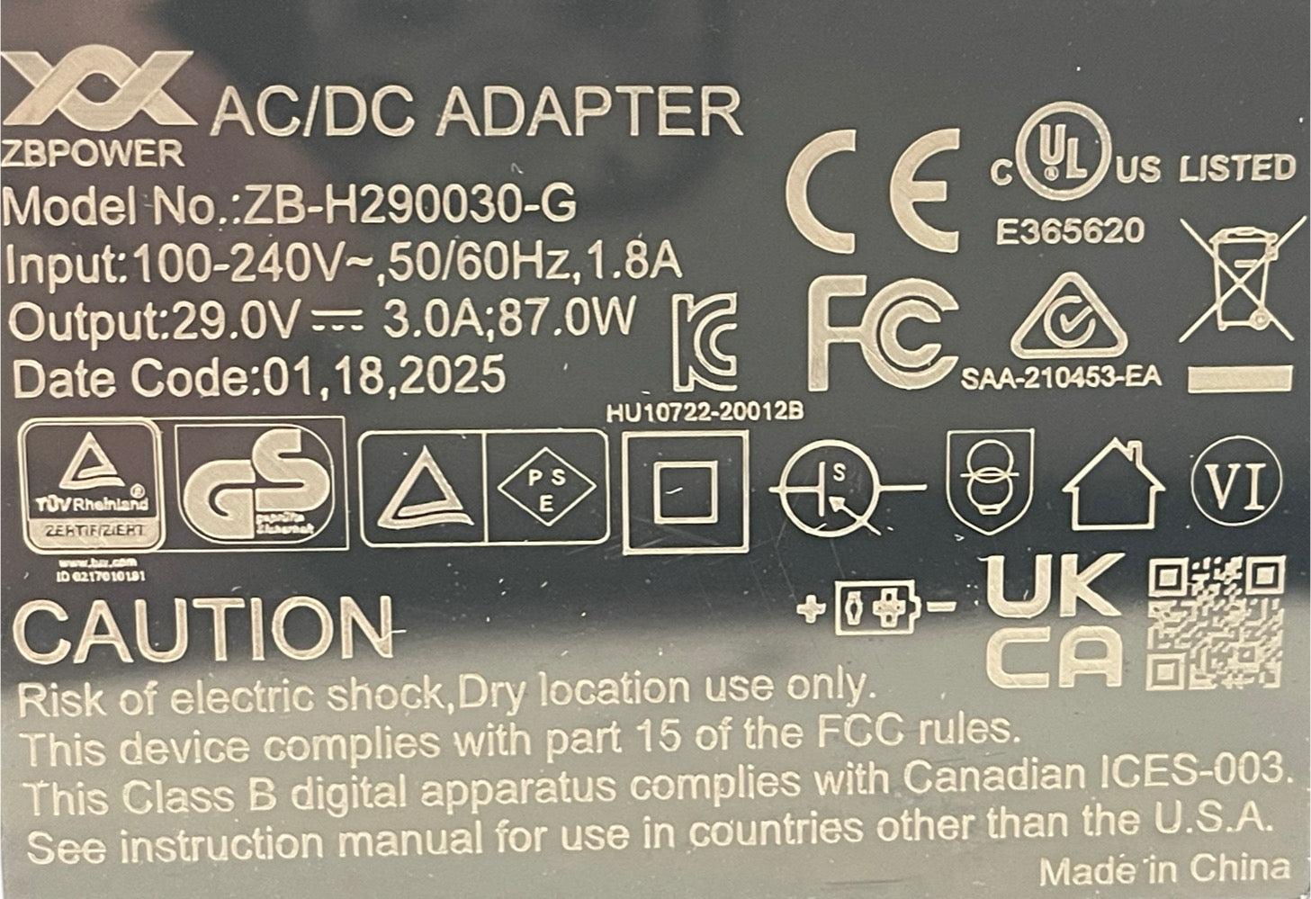 - Input: 100 – 240V, 50/60Hz, 1.5amp (Australian figure 8 mains power cord)